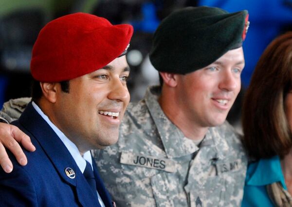 Staff Sgt. Robert Gutierrez, Air Force Cross recipient and combat controller, poses with Sgt. 1st Class Mike Jones, the Army medic who saved Gutierrez' life during a 2009 mission in Afghanistan. (Air Force photo)